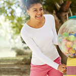 Shaped side seams for a feminine fit. Cotton/Lycra® rib crew neck with taped neckline. Produced using Belcoro® yarn for a softer feel and cleaner printing process. Fine knit gauge for enhanced printability.