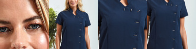Beauty and Spa tunic with Mandarin collar. Asymmetric button fastening to the front with 8 bar shaped buttons. Short sleeve. Side vents. Back pleat for ease of movement. Princess seams. Easycare. Size 8, 10, 12, 14,16, 18, 20, 22, 24